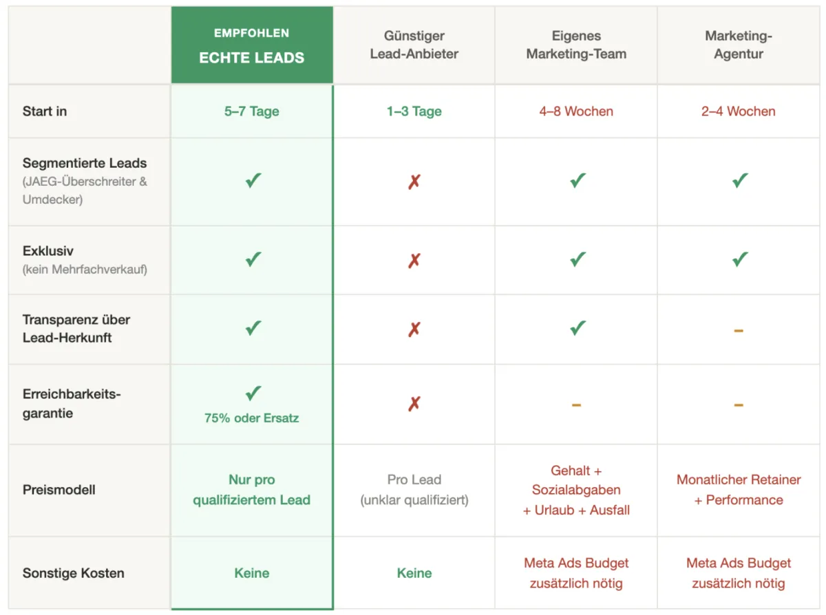 Der ROI stimmt, wenn die Qualität stimmt: Bei einer PKV-Courtage von 7 bis 9 Monatsbeiträgen und einem PKV-Neueinsteiger mit 500€ Monatsbeitrag verdienst du 3.500 bis 4.500€ pro Abschluss. Bei einer Abschlussquote von 1 zu 10 kostet dich ein Abschluss 950 bis 1.500€ in Lead-Investition. ROI: 150 bis 300%. Ohne laufende Bestandsprovision.